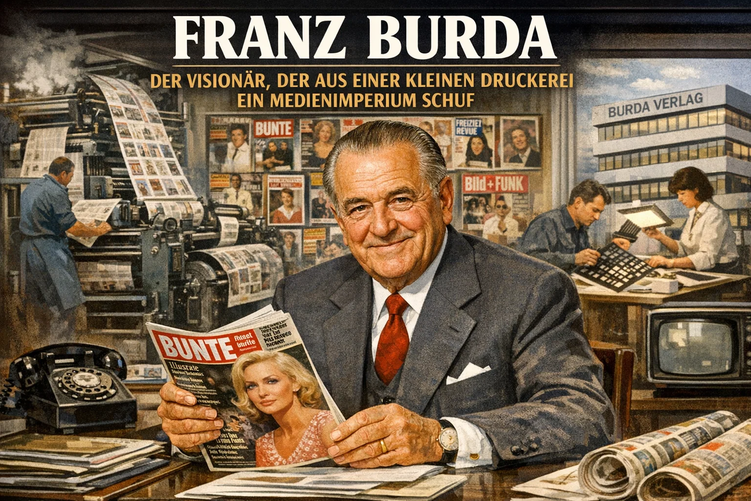 Nach dem Krieg stand Deutschland vor dem Nichts, doch Franz Burda sah Chancen. Die Druckerei druckte Schulbücher und Briefmarken für die französische Besatzungszone. Schnell startete er neue Zeitschriften: Das Ufer, das später Bunte wurde, brachte Farbfotos und Unterhaltung in die Wohnzimmer. Die Leser liebten es – endlich wieder Farbe und Lebensfreude nach den grauen Jahren. erkannte den Bedarf an leichter, bunter Lektüre und lieferte sie.