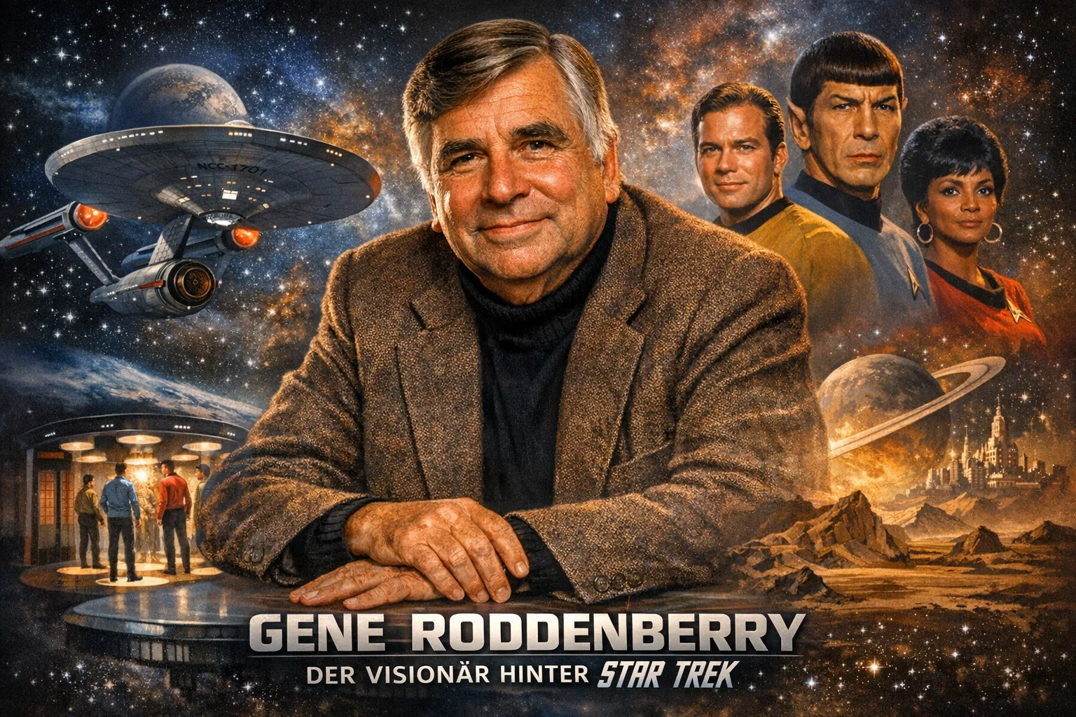 Gene Roddenberry war mehr als nur ein Fernsehproduzent – er war ein Träumer, der die Zukunft der Menschheit in den Sternen sah. Als Schöpfer der ikonischen Serie Star Trek hat er nicht nur ein Unterhaltungsimperium aufgebaut, sondern auch eine Philosophie der Hoffnung, Vielfalt und Erkundung vermittelt. Seine Ideen haben Millionen inspiriert und die Popkultur nachhaltig geprägt. In einer Zeit, in der Science Fiction noch als Nischengenre galt, wagte Gene Roddenberry es, eine Welt zu erschaffen, in der Kriege, Armut und Vorurteile überwunden sind. Seine Serie Raumschiff Enterprise wurde zum Symbol für eine bessere Zukunft, und sein Einfluss reicht bis heute in Filme, Serien und sogar reale Raumfahrttechnologien.