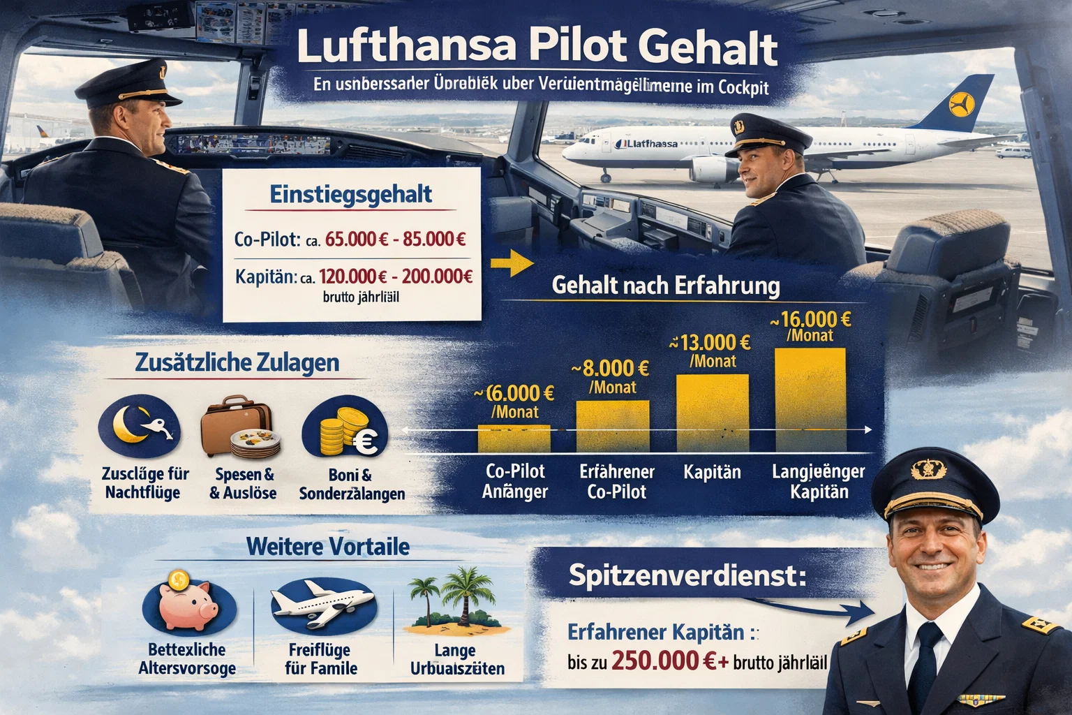Zulagen umfassen Schichtzuschläge (bis 50% für Wochenenden), Überstunden und Gewinnbeteiligung. Das Lufthansa Pilot Gehalt wird dadurch oft um 20% gesteigert. Altersvorsorge und Freiflüge sind weitere Perks.