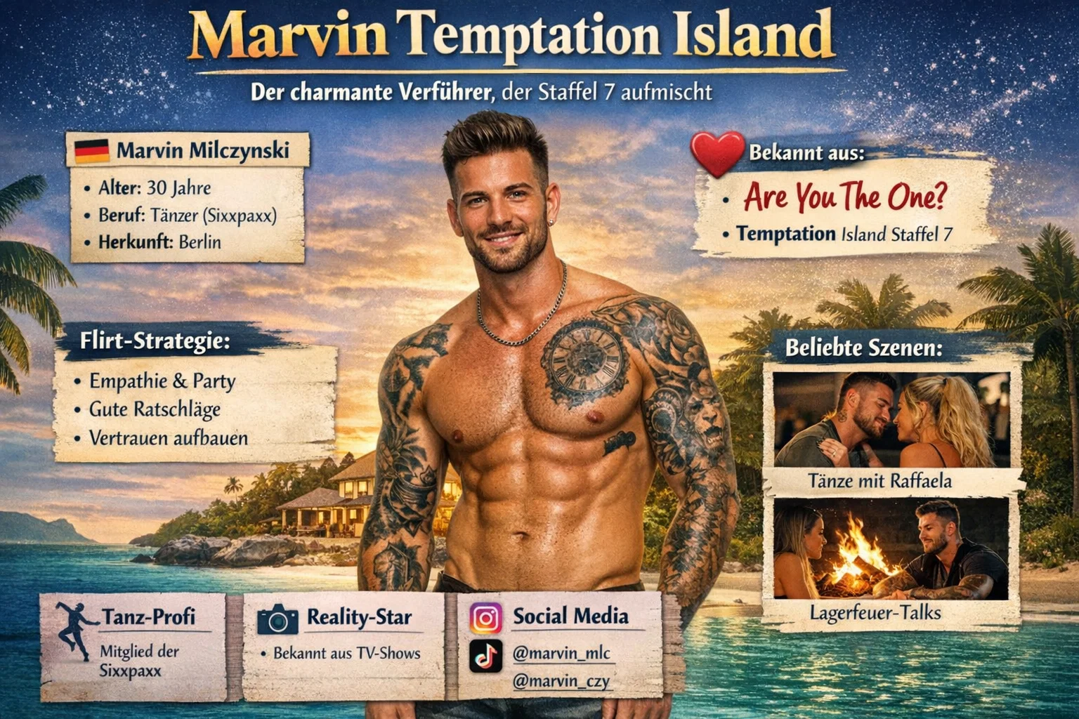 Marvin Temptation Island – dieser Name ist in der deutschen Reality-TV-Szene mittlerweile ein Begriff, der für Charme, Tanzkünste und eine Prise Drama steht. Wenn du dich für Shows wie Temptation Island interessierst, kennst du vielleicht schon die spannenden Geschichten um Treue-Tests, Verführungen und emotionale Achterbahnen. Marvin Milczynski, der 30-jährige Tänzer aus Berlin, hat in Staffel 7 als Verführer für ordentlich Aufsehen gesorgt. Er bringt nicht nur seinen athletischen Körper und seine Tattoos mit, sondern auch eine Strategie, die auf Empathie und Party-Stimmung setzt. In diesem Artikel tauchen wir tief in sein Leben ein, schauen uns an, was ihn antreibt und warum er perfekt in die Welt von Temptation Island passt.