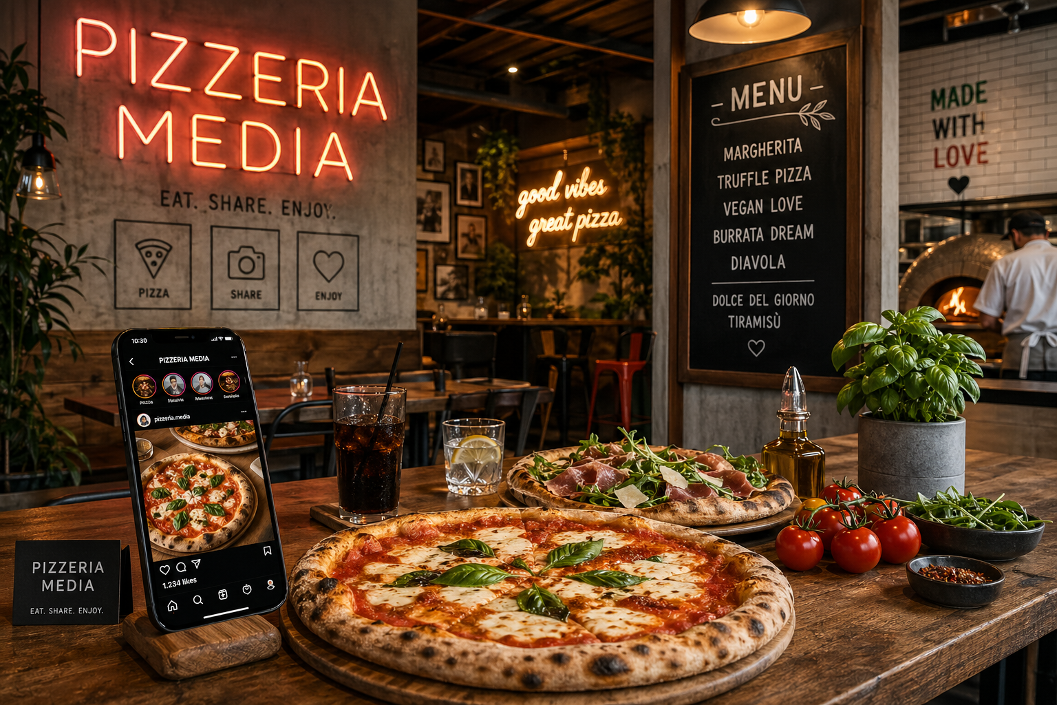 Eine pizzeria media ist ein modernes Gastronomiekonzept, das traditionelle Pizza mit digitalem Marketing, Design und Erlebnisgastronomie kombiniert.