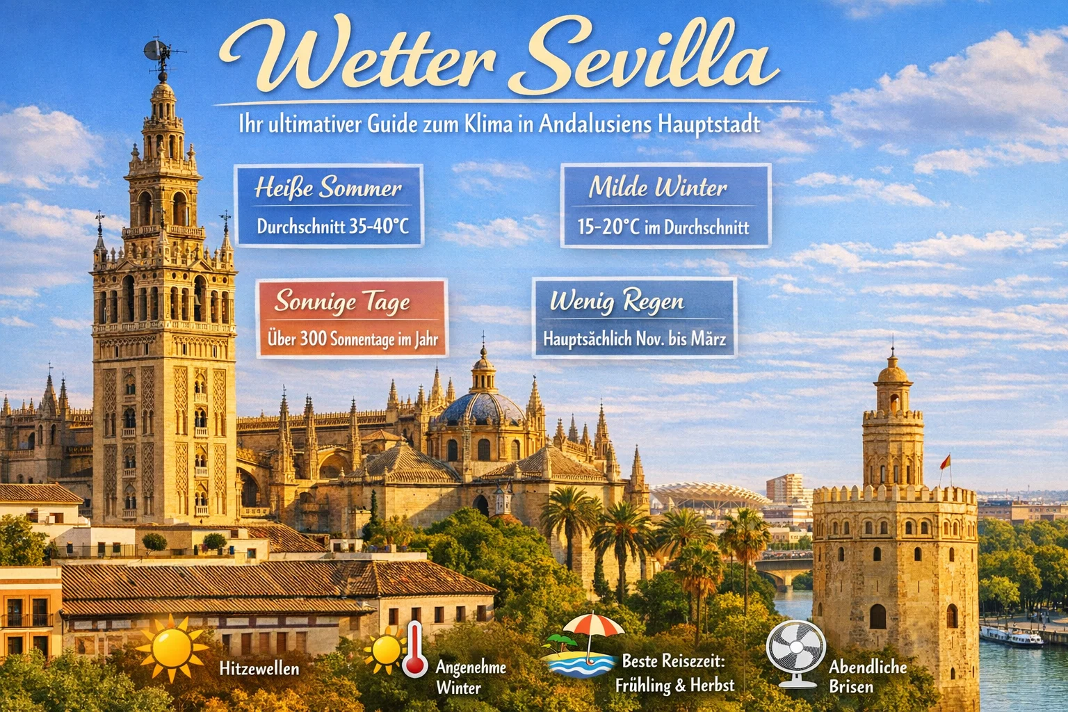 Das Wetter Sevilla fasziniert Reisende aus aller Welt, denn die andalusische Metropole vereint mediterranes Flair mit extremen Temperaturschwankungen, die jede Jahreszeit zu einem Abenteuer machen. Ob Sie die heißen Sommer mit ihren strahlenden Sonnentagen lieben oder die milden Winter mit gelegentlichen Regenschauern bevorzugen – hier finden Sie alle Infos, die Sie brauchen, um Ihre Reise optimal zu gestalten. Von der aktuellen Wettervorhersage bis hin zu praktischen Tipps für Outdoor-Aktivitäten: Dieser Guide hilft Ihnen, Sevilla wettertechnisch voll auszukosten.